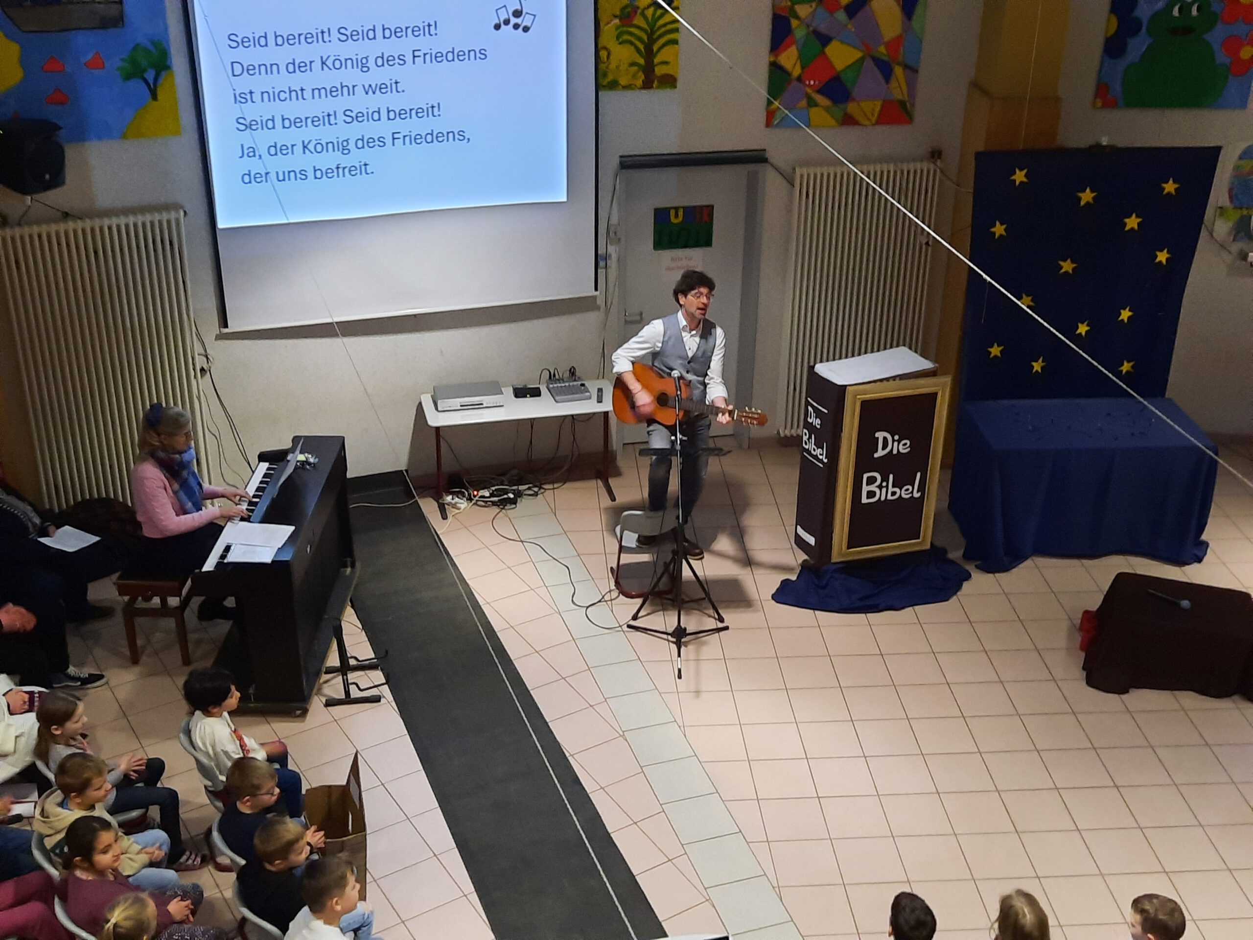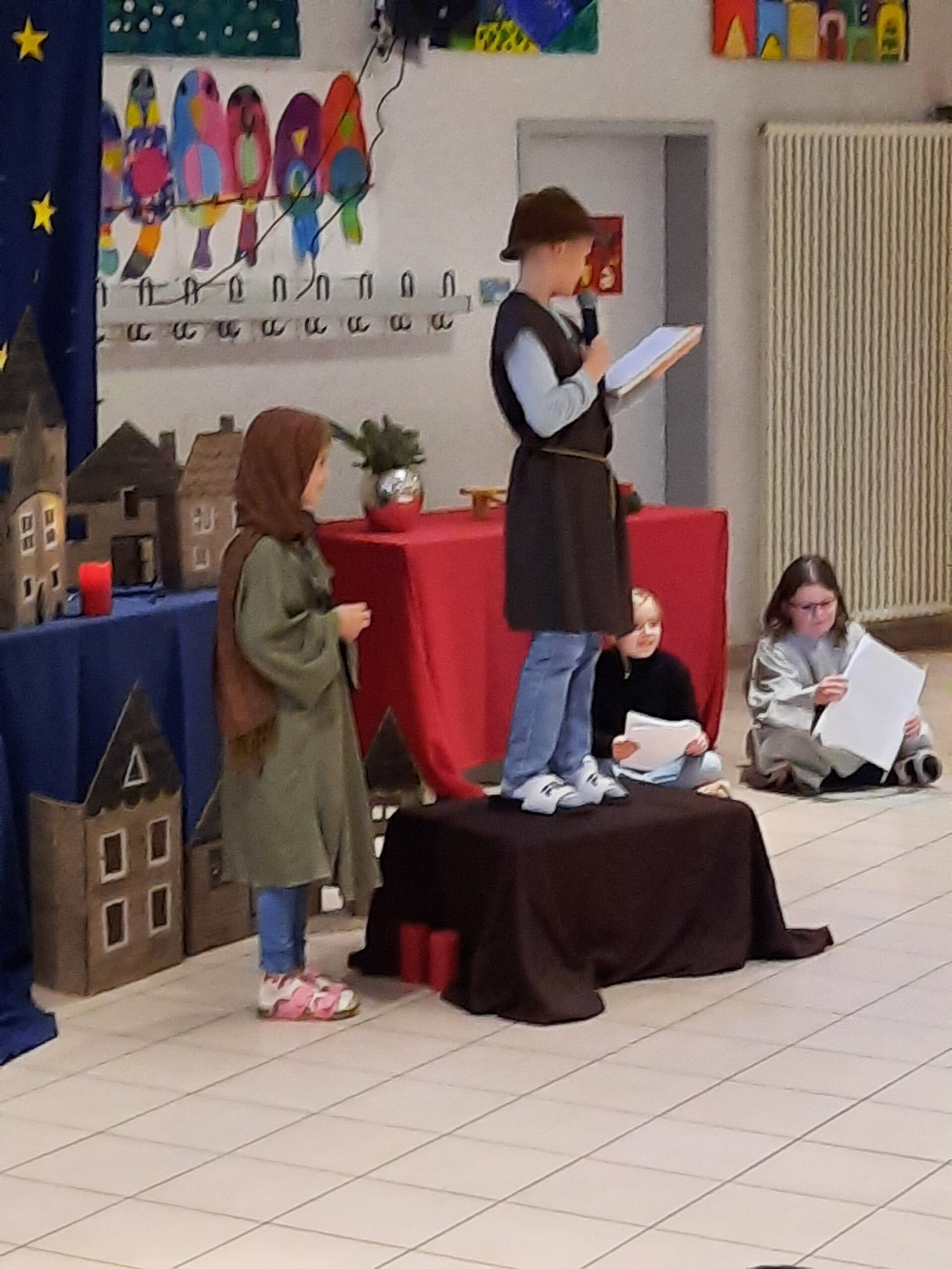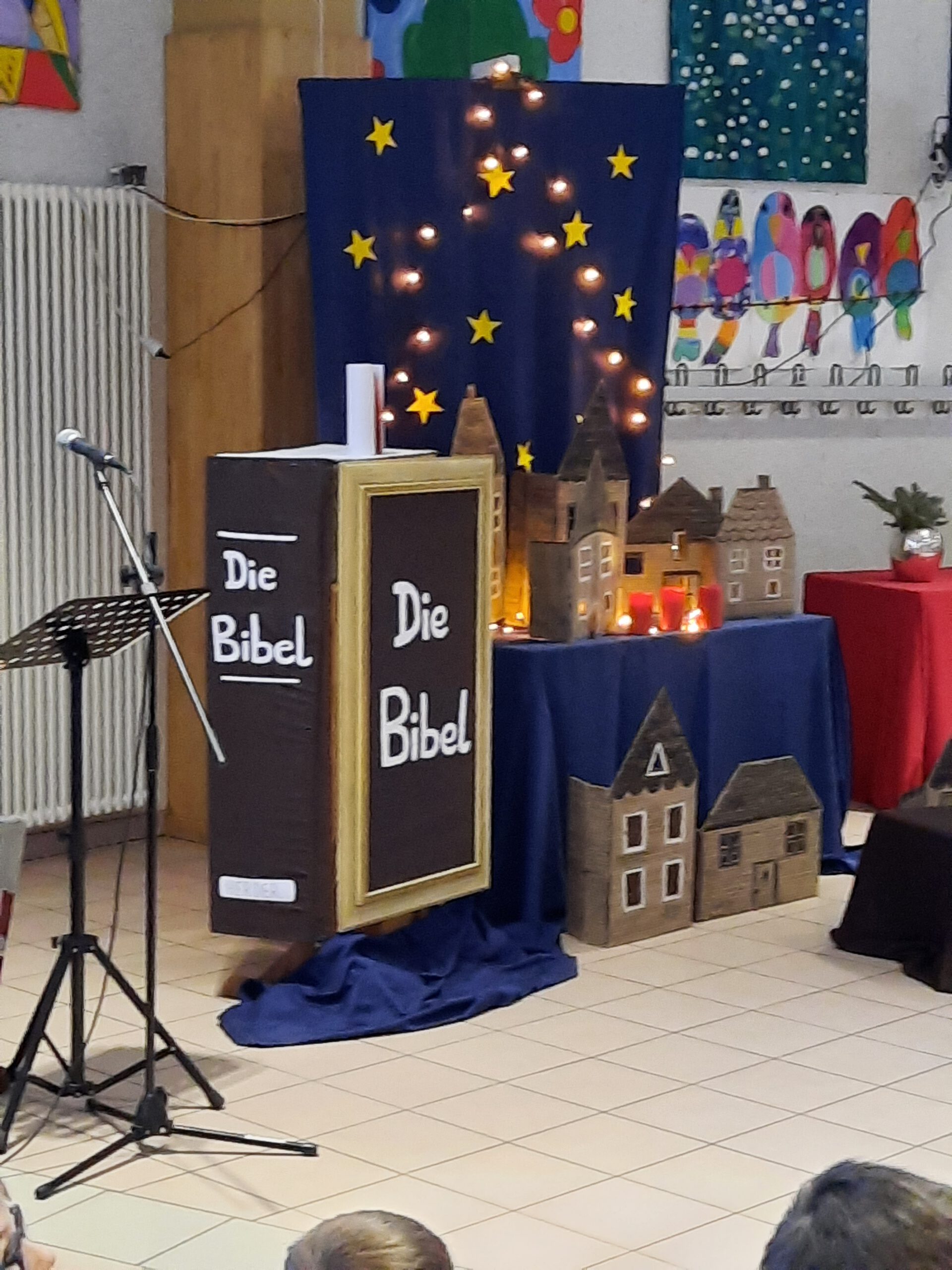 Eines der Highlights war das anschließende Krippenspiel. Ein besonderer Blickfang war hierbei die begehbare Bibel, durch welche die Kinder die Bühne betraten – ein herzliches Dankeschön geht an dieser Stelle an Frau Duda für diese tolle Gestaltung! Das Stück zeigte eindrucksvoll, wie jeder Einzelne von uns dazu beitragen kann, dass mehr Licht in das Leben anderer Menschen tritt.
